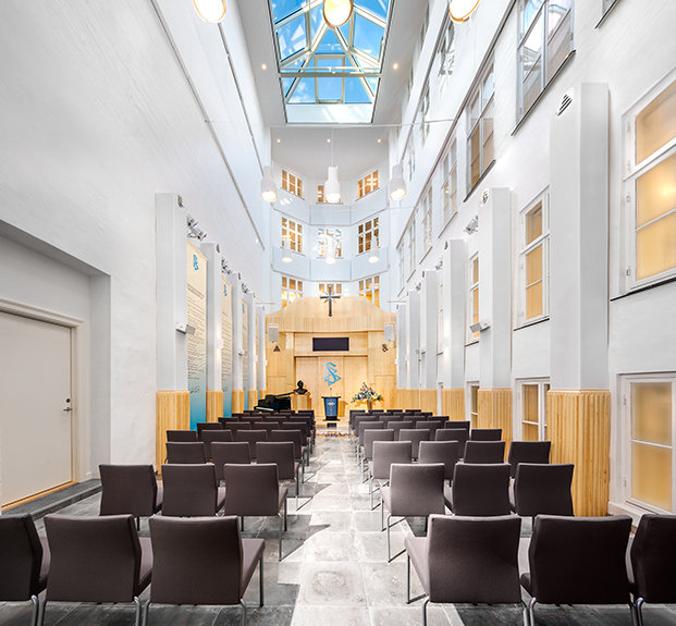 De Kerk herontwierp, herstelde en vernieuwde haar nieuwe thuis in het centrum van Kopenhagen. Dit Neoklassieke gebouw met een oppervlakte van 3700 vierkante meter werd oorspronkelijk in 1796 gebouwd en werd geboren uit de vlammen van het “Grote Vuur” van het jaar ervoor, dat het hele Nytorv/Gammeltorv district had verslonden. De stadsplanning verordende een gevel met de duidelijk herkenbare “gebroken hoek”, zodat brandweerwagens met lange ladders de smalle straatjes in konden.