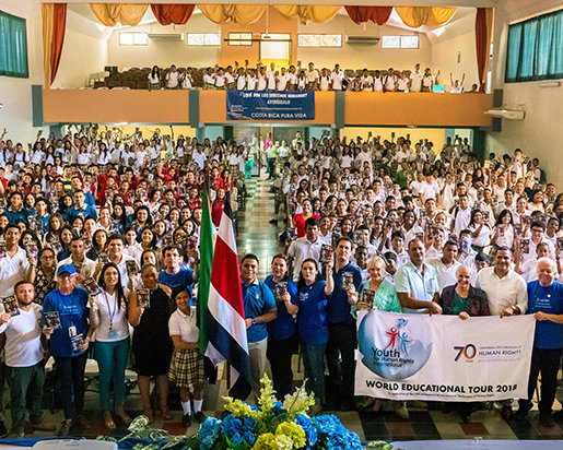 - In Costa Rica, waar het Jongeren voor Mensenrechten boekje een officiële publicatie werd van het nationale voetbalteam dat naar het wereldkampioenschap ging. Dat begon een beweging in alle 82 districten en daarbij werden in het totaal 2 miljoen mensen bereikt.