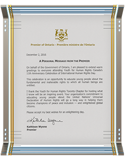 - United for Human Rights en Youth for Human Rights, die een mensenrechtenbeweging in Toronto hebben ontketend – de etnisch meest diverse stad op aarde, verder in het dichtstbevolkte land van Afrika, Nigeria en in Sri Lanka, waar hindoes, boeddhisten, christenen en moslims samenwerkten om de Universele Verklaring van de Rechten van de Mens te verspreiden.